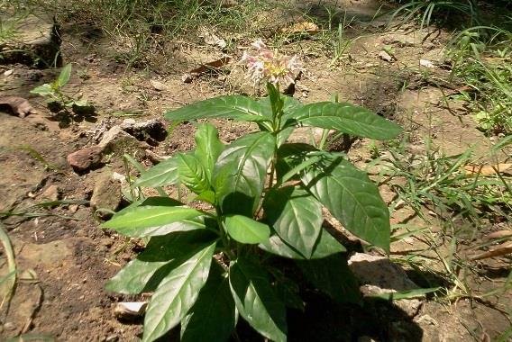 The Sarpagandha plant is a small evergreen shrub that grows up to 60-90 cm tall. It has bright green leaves that grow in groups of three. The flowers are small and can be white, pink, or sometimes light purple.